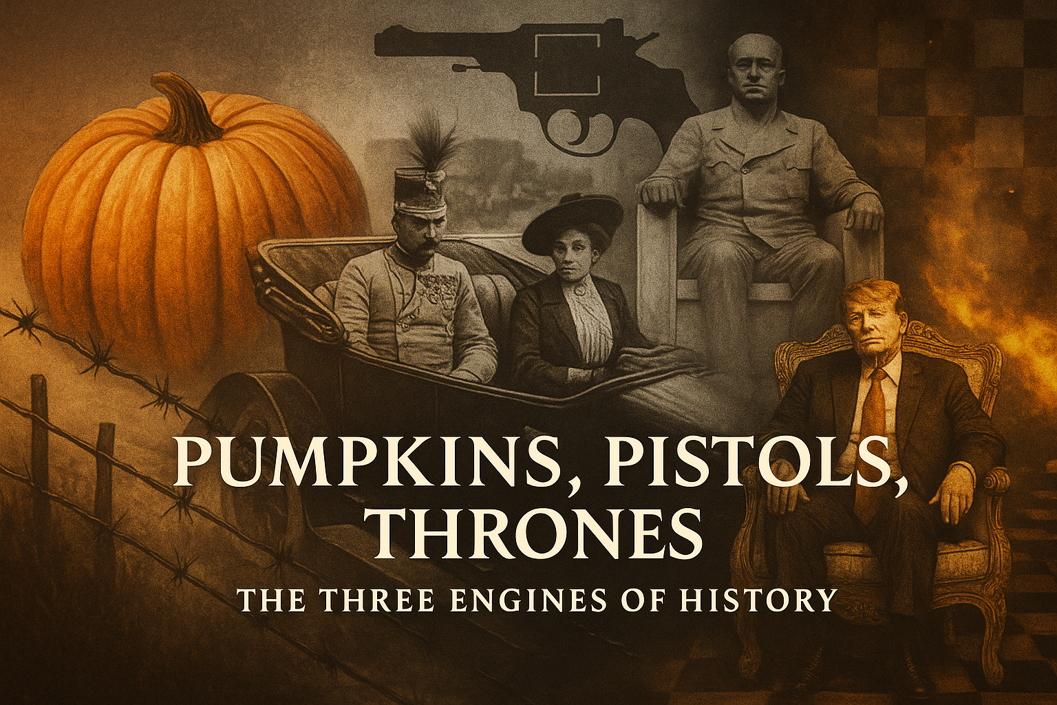 And wars have been fought for less. From pumpkin fields to pistols: Sarajevo, 1914. A single shot echoed through the air. An empire’s heir crumpled in a motorcar. Europe’s alliances, brittle as glass, shattered into the First World War. History’s chest was opened by one bullet, and the world bled in trenches.